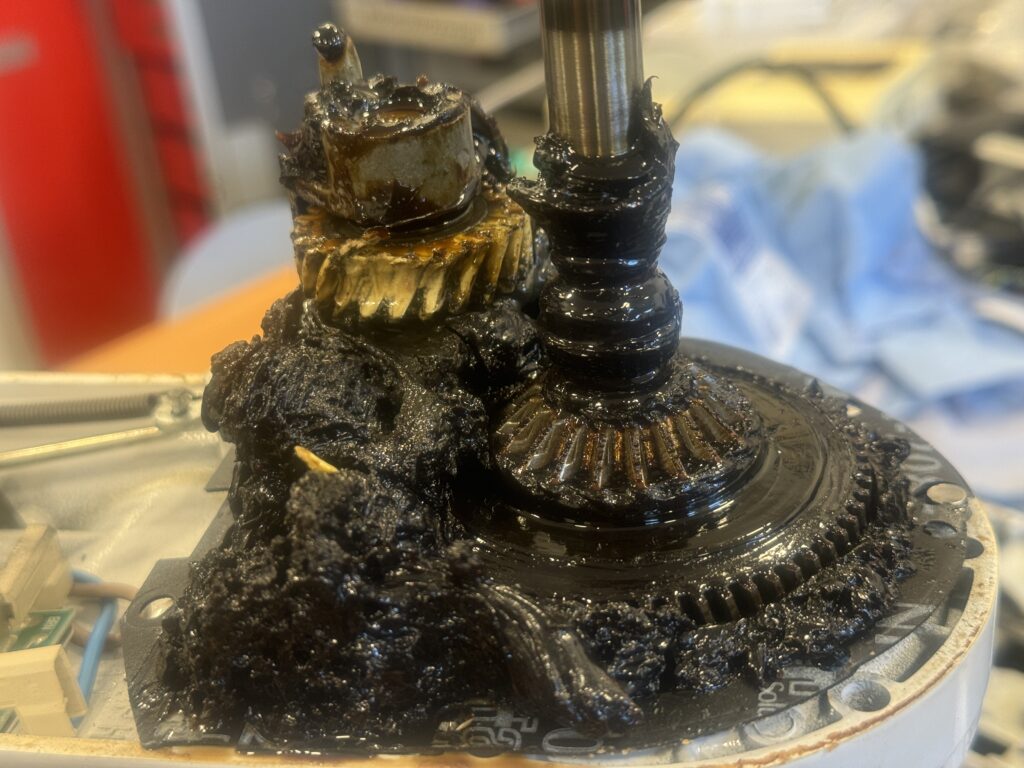 Austausch des Zahnrads (Hinweis: Originalbauteil verwenden, da die günstig verfügbaren China-Nachbauten keine so gute Verbindung zwischen Kunststoff Zahnkranz und Metall-Grundkörper haben und daher schneller kaputt gehen. Außerdem empfiehlt sich der Austausch der kompletten Baugruppe, da Reinigung und Umbau des einzelnen Zahnrads zu aufwendig ist)