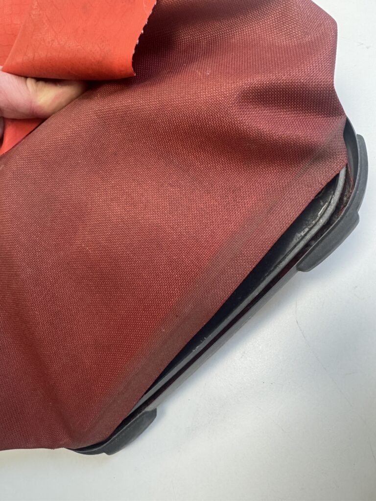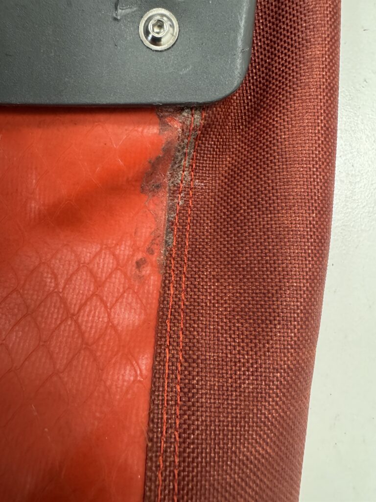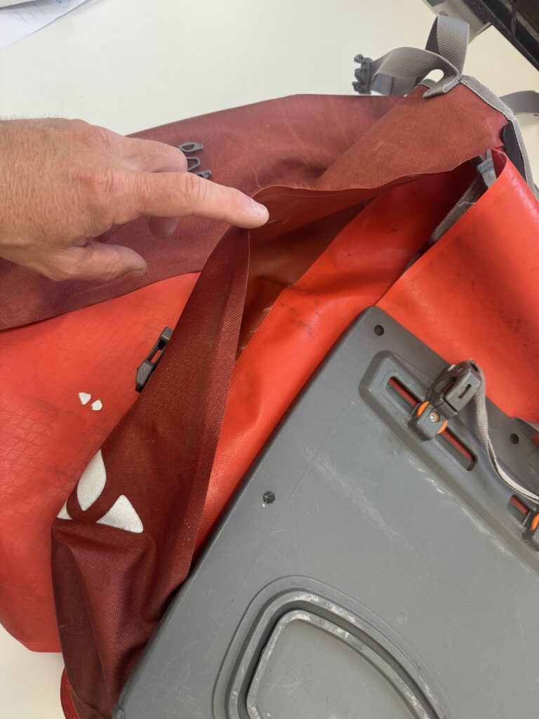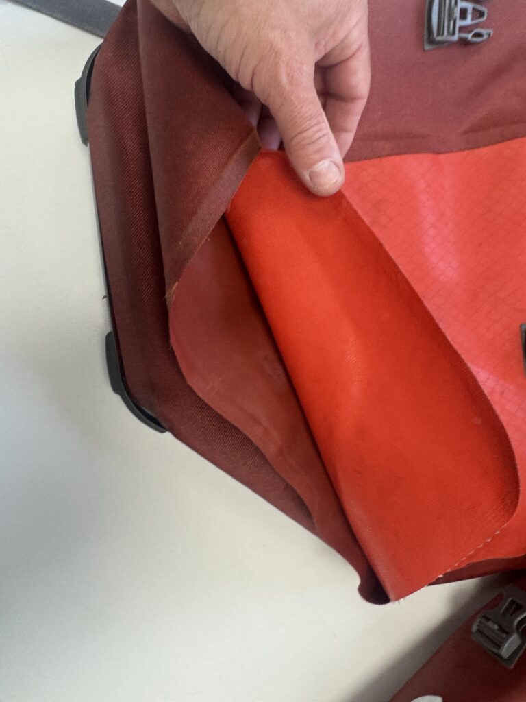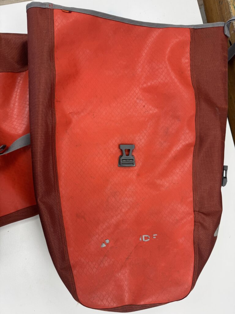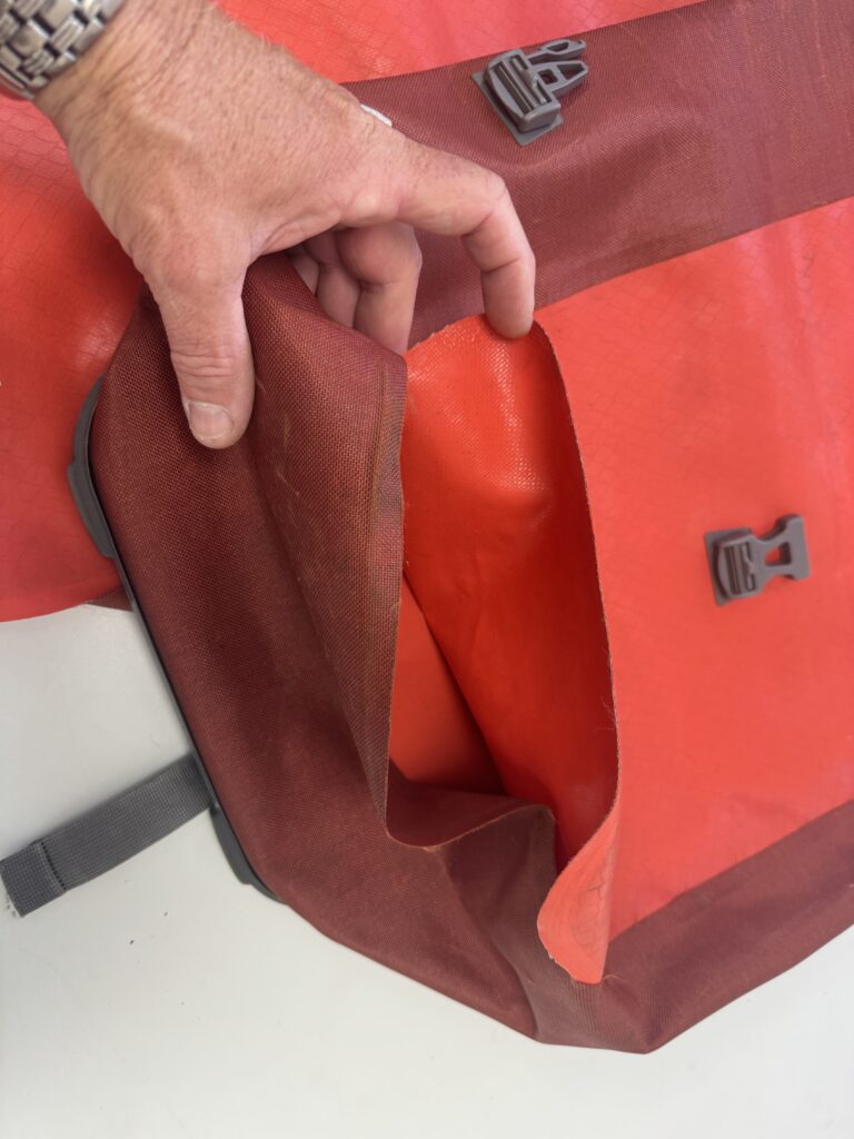 Fehler: Delamination der Schweißnähte an allen Nähten bei beiden Taschen (Nachschweißen wird von Vaude angeboten für 40,- Euro pro Tasche)