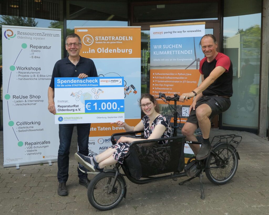 Unser Unterstützerkreis wächst! Wir haben im Rahmen der Aktion STADTRADELN vom Unternehmen energy & meteo systems (emsys) eine Spende in Höhe von 1.000 Euro erhalten. Wir danken Herrn Dr. Ulrich Focken, einem der Geschäftsführer und Mitbegründer von emsys ganz herzlich. Denn um unsere ehrenamtlichen Projekte rund um die Rettung nützlicher Gegenständen weiterführen zu können, sind wir auf finanzielle Unterstützung angewiesen.