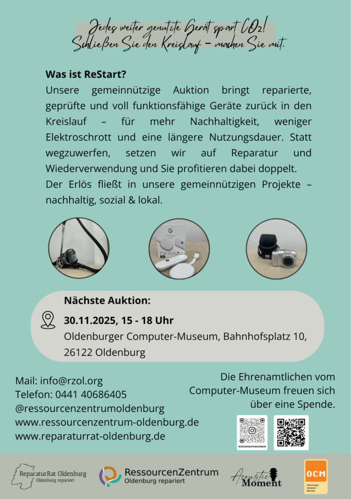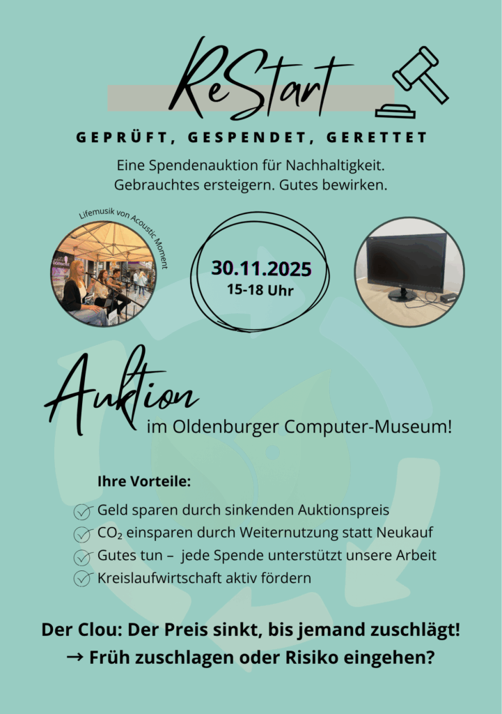 Am 30.11.2025 von 15 – 18 Uhr findet eine Spendenauktion mit gebrauchten, überprüften Elektrogeräten statt. Das Spannende: Der Preis sinkt, bis jemand zuschlägt! Im Oldenburger Computer-Museum können die Geräte ersteigert werden. Außerdem gibt es Livemusik von Acoustic Moment und Getränke. Die Ausstellung des Computer-Museums ist ebenfalls geöffnet. Der Verein freut sich über eine Spende statt eines Eintrittspreises.