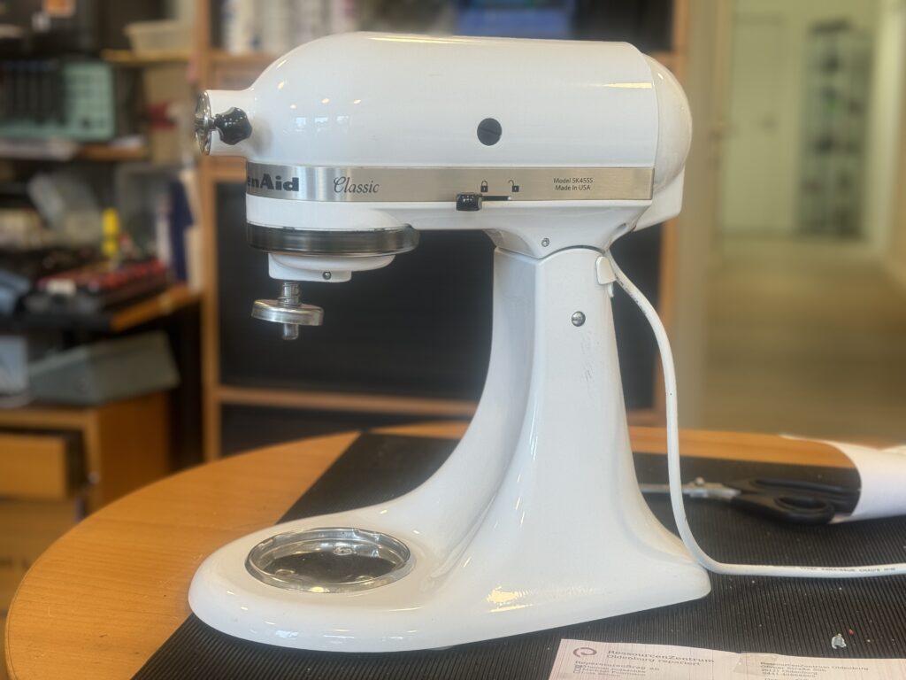 Artikel: Küchenmaschine Model 5K45SS Hersteller: Kitchen Aid (Whirlpool) Alter: ca. 5 Jahre Neupreis: ca. 400,- Euro Fehler: Getriebeschaden: Motor läuft, Antrieb bewegt sich nicht Öffnen: Das Gehäuse ist verschraubt und kann einfach aufgeschraubt werden. Bei neueren/aktuellen Geräten finden spezielle Schrauben mit Vierkant-Antrieb Verwendung, die Spezialwerkzeug erfordern. Diagnose:    Zwischen Motor und Rührwerksantrieb befindet sich ein Zahnrad aus