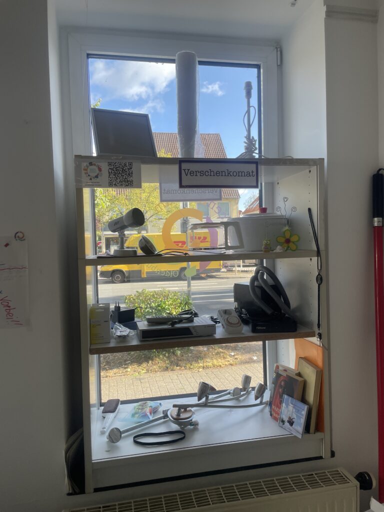 Wie an mehreren Stellen in Oldenburg gibt es auch bei uns ein Verschenkeregal. Hier findet ihr verschiedenste Dinge, die ihr euch einfach mitnehmen dürft. Das Regal steht in unserem Vorraum, ist also immer zu unseren Öffnungszeiten verfügbar.